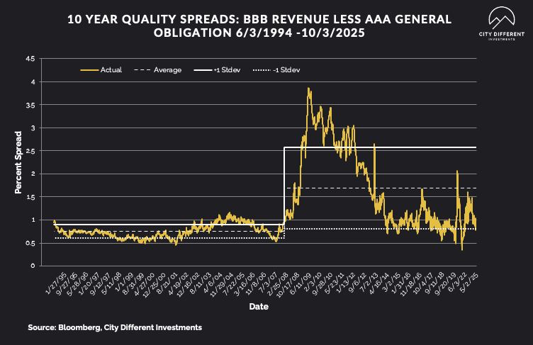 The 10-year quality credit spread between BBB revenue less AAA general obligation bonds for last week was at 0.91% versus a historical average of 1.68%, demonstrating very healthy and tight spread metrics.