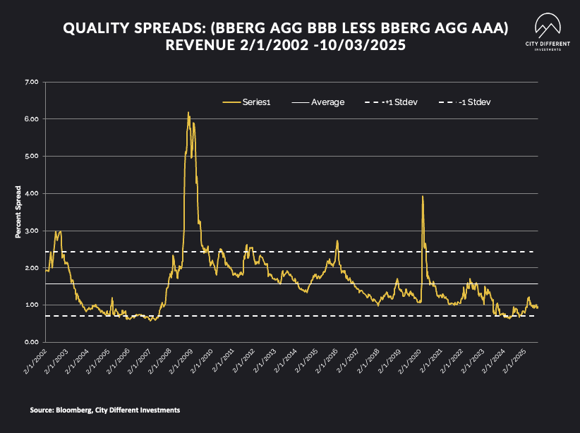 Treasury rates moved slightly higher on the week as investors anticipated further Fed rate cuts. The government shutdown did not seem to impact investor behavior. Investors seem to be anticipating a short duration to the conflict. There have been 21 funding gaps since 1977. The last and longest shutdown began in December 2018 and lasted 35 days. (Who holds the record for the longest government shutdown?) The 2/10-year spread stayed range-bound at 57 basis points. That is 2 basis points steeper than last week.