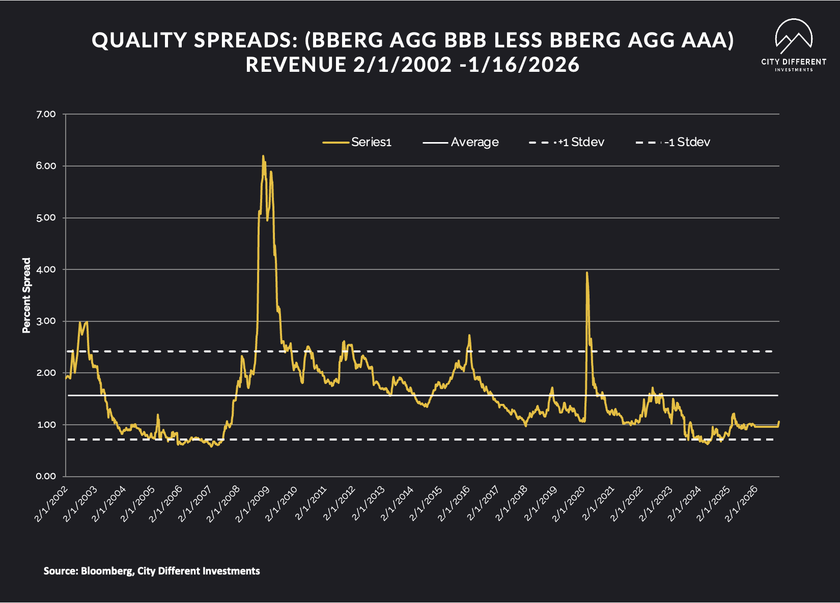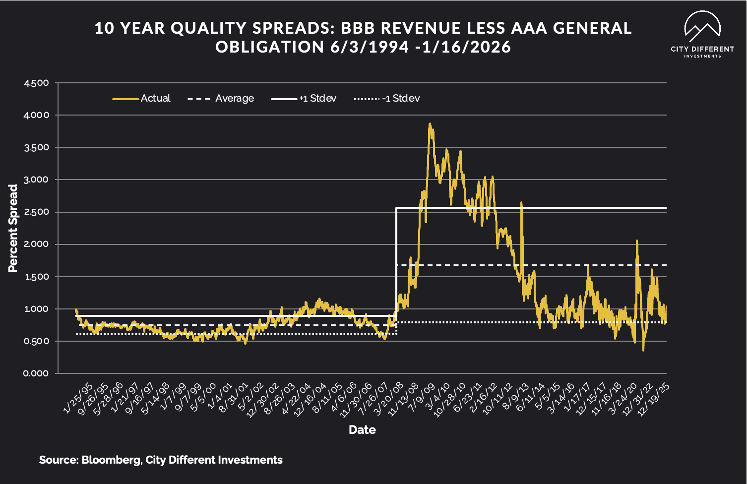 Last week's 10-year quality credit spread stayed stagnant week over week between BBB revenue bonds and AAA general obligation bonds at 0.96%. The historical average credit spread is at 1.68%.