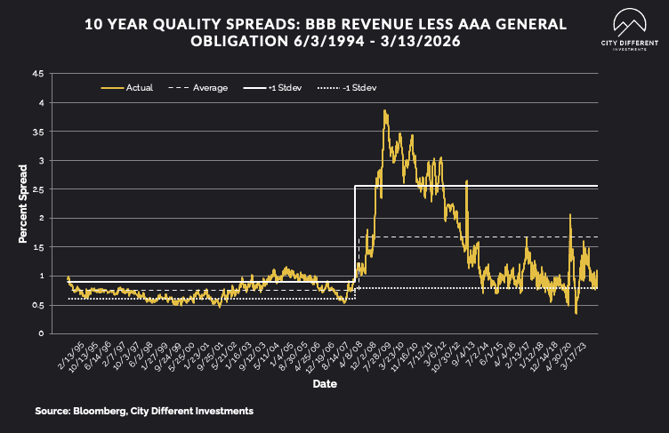 Last week's 10-year quality credit spread between BBB revenue bonds and AAA general obligation bonds was 0.86%, higher by 1 basis point for the week. The historical average credit spread is at 1.68%.